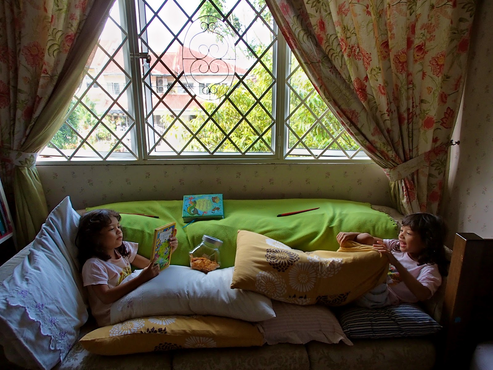 Yesterday we have decided not to go anywhere:):) We stayed full-time at home.Dulu2 orang mana keluar tiap minggu, kat kampung hujung minggu adalah untuk berehat,duduk bawah pokok rambutan buat penyapu dari lidi kelapa,menjahit baju yang koyak,menggembur batas sayur dan paling jauh pun ke kebun orang kampung mencari kacang panjang,ikan kolam untuk dibuat lauk.Dah masak dan makan selalunya berehat di serambi rumah atau tangga,baca suratkhabar atau makan ais krim Malaysia, petang turun ke bawah mencari pisang atau mencabut ubi untuk dibuat goreng atau pun menggentel tepung untuk buat puteri mandi:) Seronok betul,hari terasa panjang dan nyaman..semua terasa seronok:):) Uwan memang selalu buat kueh masa di kampung,tiap petang mesti ada tetamu samada saudara atau kawannya datang bertandang ,duduk di pangkin luas bawah pokok rambutan.As for me i just feel happy reading my story book under the tree or with half of my body hidden under the bed.